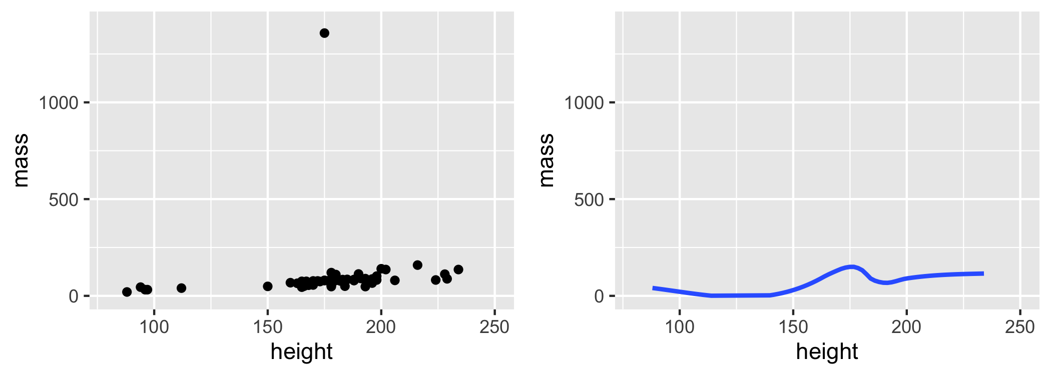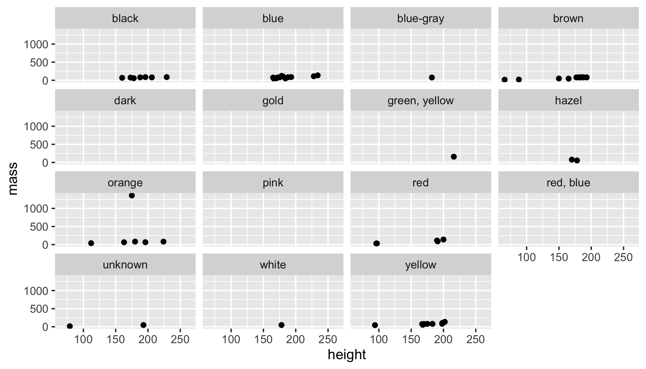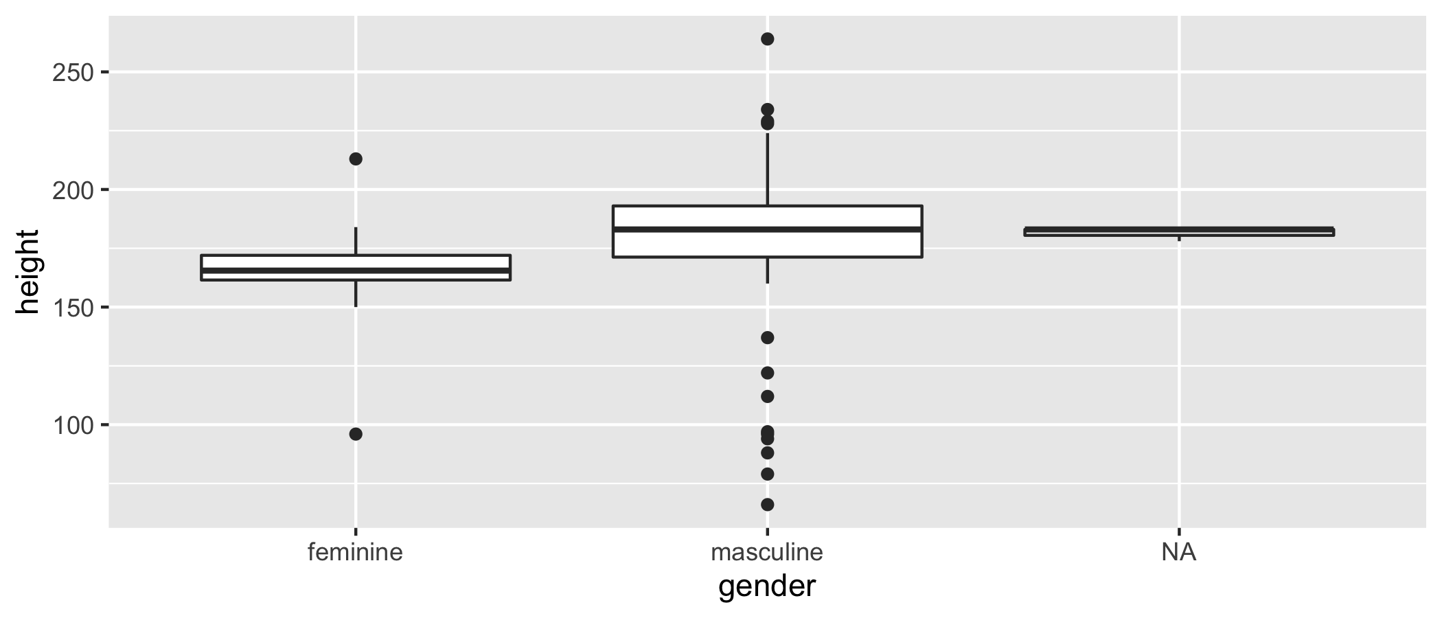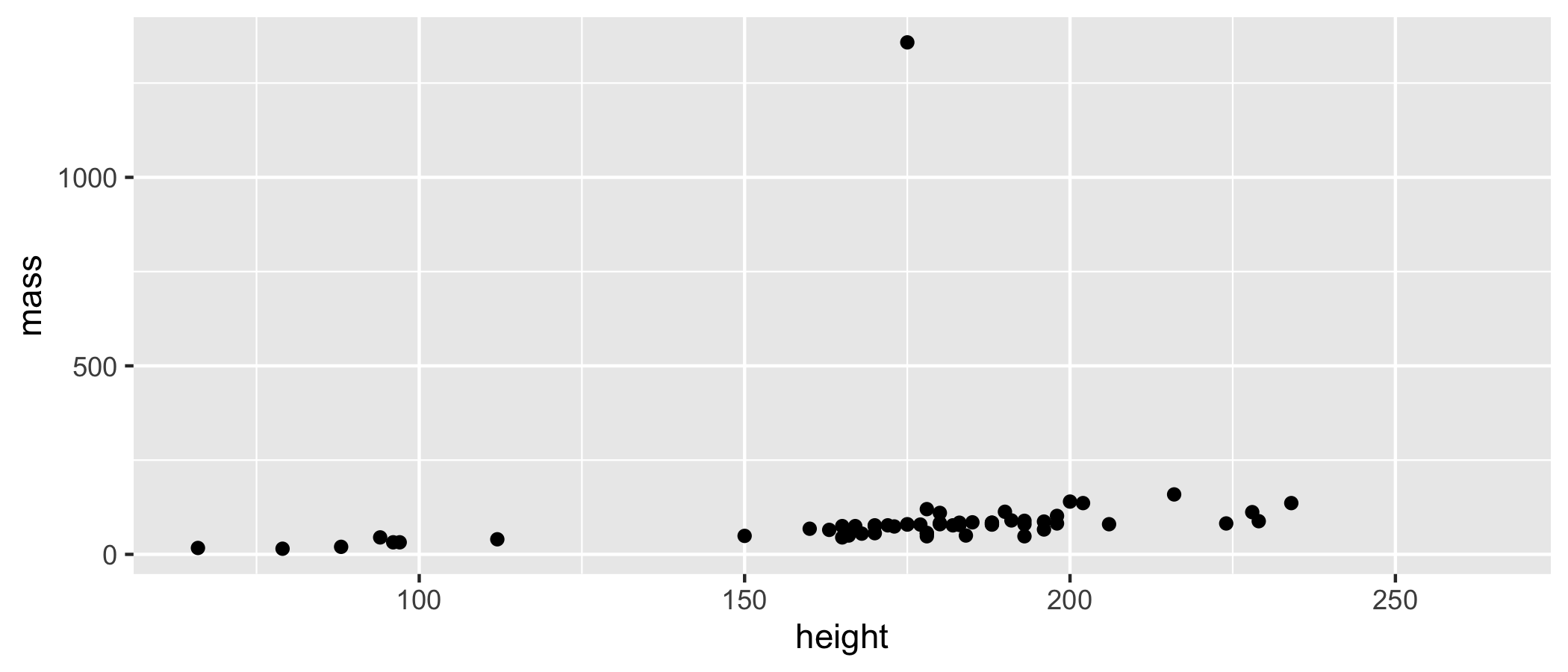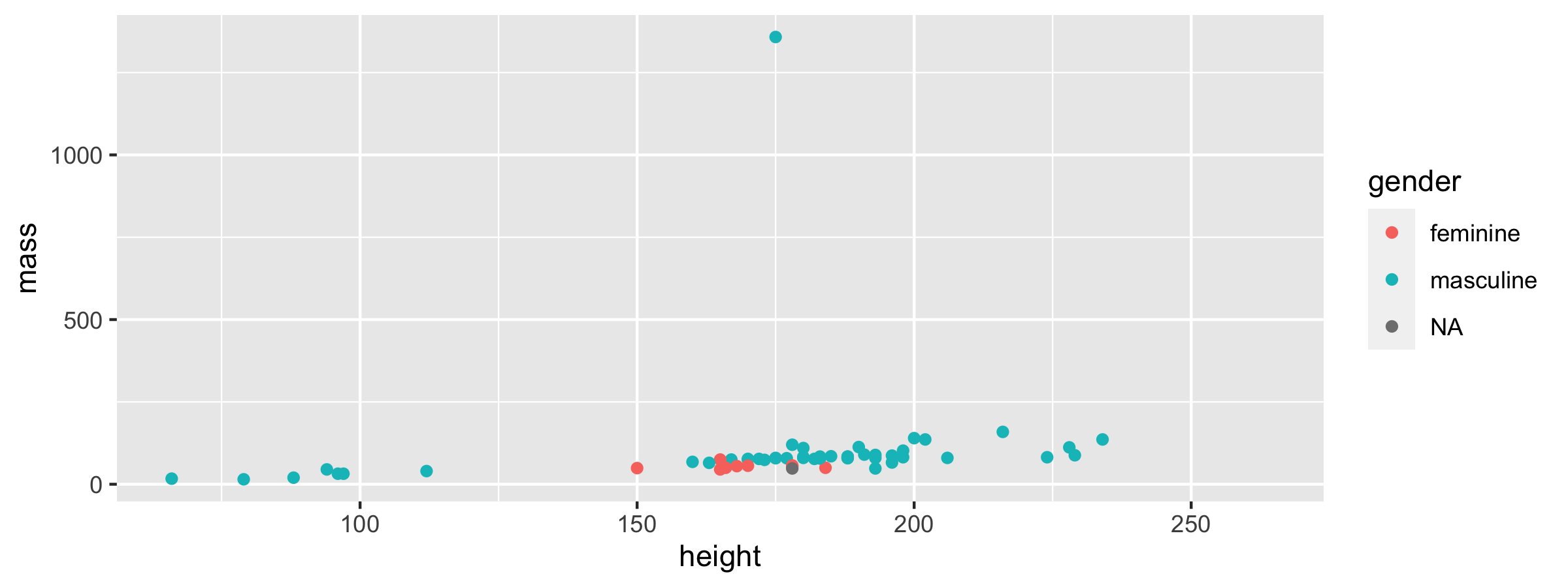 class: ur-title, center, middle, title-slide # BST430 Lecture 2 ## ggplot (i) ### Andrew McDavid ### U of Rochester ### 2021-08-29 (updated: 2021-08-29) --- ## Catch up - Catch up on informal "requirements": + Add your name (first and last) to your GitHub profile, ideally add your photo as well + Similarly, add your name (first and last) to your RStudio.Cloud profile as well <!-- - Tips for asking questions via GitHub issues--> --- ## Agenda - Exploratory data analysis - Data visualization - Visualizing Star Wars - Aesthetics - Faceting - Identifying variables - Visualizing numerical data - Visualizing categorical data --- class: center, middle # Exploratory data analysis --- ## What is EDA?  - Exploratory data analysis (EDA) is an approach to analyzing data sets to summarize its main characteristics. - Often, this is visual. That's what we're focusing on today. - But we might also calculate summary statistics and perform data wrangling/manipulation/transformation at (or before) this stage of the analysis. --- class: center, middle # Data visualization --- ## Data visualization > *"The simple graph has brought more information to the data analyst’s mind than any other device." — John Tukey* - Data visualization is the creation and study of the visual representation of data. - There are many tools for visualizing data (R is one of them), and many approaches/systems within R for making data visualizations (**ggplot2** is one of them, and that's the one we're going to use). --- ## ggplot2, part of the tidyverse - ggplot2 is a data visualization package - To use ggplot2 functions, first load tidyverse ```r library(tidyverse) ``` - In ggplot2 the structure of the code for plots can often be summarized as ```r ggplot + geom_xxx ``` or, more precisely .small[ ```r ggplot(data = [dataset], mapping = aes(x = [x-variable], y = [y-variable])) + geom_xxx() + other options ``` ] - Geoms, short for geometric objects, describe the type of plot you will produce --- ## About ggplot2 - ggplot2 is the name of the package - The `gg` in "ggplot2" stands for Grammar of Graphics - Inspired by the book **Grammar of Graphics** by Leland Wilkinson - `ggplot()` is the main function in ggplot2 - For help with the ggplot2, see http://ggplot2.tidyverse.org/ --- class: center, middle # Visualizing Star Wars --- ## Dataset terminology .scroll-box-14[ ```r starwars ``` ``` ## # A tibble: 87 × 14 ## name height mass hair_color skin_color eye_color birth_year sex gender ## <chr> <int> <dbl> <chr> <chr> <chr> <dbl> <chr> <chr> ## 1 Luke S… 172 77 blond fair blue 19 male mascu… ## 2 C-3PO 167 75 <NA> gold yellow 112 none mascu… ## 3 R2-D2 96 32 <NA> white, bl… red 33 none mascu… ## 4 Darth … 202 136 none white yellow 41.9 male mascu… ## 5 Leia O… 150 49 brown light brown 19 fema… femin… ## 6 Owen L… 178 120 brown, grey light blue 52 male mascu… ## 7 Beru W… 165 75 brown light blue 47 fema… femin… ## 8 R5-D4 97 32 <NA> white, red red NA none mascu… ## 9 Biggs … 183 84 black light brown 24 male mascu… ## 10 Obi-Wa… 182 77 auburn, wh… fair blue-gray 57 male mascu… ## # … with 77 more rows, and 5 more variables: homeworld <chr>, species <chr>, ## # films <list>, vehicles <list>, starships <list> ``` ] <div class="question"> What does each row represent? What does each column represent? </div> --- ## Luke Skywalker  --- ## What's in the Star Wars data? Take a `glimpse` at the data: .scroll-box-14[ ```r glimpse(starwars) ``` ``` ## Rows: 87 ## Columns: 14 ## $ name <chr> "Luke Skywalker", "C-3PO", "R2-D2", "Darth Vader", "Leia Or… ## $ height <int> 172, 167, 96, 202, 150, 178, 165, 97, 183, 182, 188, 180, 2… ## $ mass <dbl> 77.0, 75.0, 32.0, 136.0, 49.0, 120.0, 75.0, 32.0, 84.0, 77.… ## $ hair_color <chr> "blond", NA, NA, "none", "brown", "brown, grey", "brown", N… ## $ skin_color <chr> "fair", "gold", "white, blue", "white", "light", "light", "… ## $ eye_color <chr> "blue", "yellow", "red", "yellow", "brown", "blue", "blue",… ## $ birth_year <dbl> 19.0, 112.0, 33.0, 41.9, 19.0, 52.0, 47.0, NA, 24.0, 57.0, … ## $ sex <chr> "male", "none", "none", "male", "female", "male", "female",… ## $ gender <chr> "masculine", "masculine", "masculine", "masculine", "femini… ## $ homeworld <chr> "Tatooine", "Tatooine", "Naboo", "Tatooine", "Alderaan", "T… ## $ species <chr> "Human", "Droid", "Droid", "Human", "Human", "Human", "Huma… ## $ films <list> <"The Empire Strikes Back", "Revenge of the Sith", "Return… ## $ vehicles <list> <"Snowspeeder", "Imperial Speeder Bike">, <>, <>, <>, "Imp… ## $ starships <list> <"X-wing", "Imperial shuttle">, <>, <>, "TIE Advanced x1",… ``` ] --- ## What's in the Star Wars data? Run the following **in the Console** to view the help ```r ?starwars ```  <div class="question"> How many rows and columns does this dataset have? What does each row represent? What does each column represent? </div> <div class="question"> Make a prediction: What relationship do you expect to see between height and mass? </div> --- ## Danged computer, stop doing what I tell you to do. <div class = "middle"> <div class="question"> What will happen if you entered this into the Console: </div> ```r glimpse(Starwars) ``` -- ```r glimpse(Starwars) ``` ``` ## Error in glimpse(Starwars): object 'Starwars' not found ``` -- .alert[R is case sensitive!] </div> --- ## Mass vs. height ```r ggplot(data = starwars, mapping = aes(x = height, y = mass)) + geom_point() ``` ``` ## Warning: Removed 28 rows containing missing values (geom_point). ``` <!-- --> --- ## What's that warning? -- - Not all characters have height and mass information (hence 28 of them not plotted) ``` ## Warning: Removed 28 rows containing missing values (geom_point). ``` - Going forward I'll suppress the warning to save room on slides, but it's important to note it --- ## Mass vs. height <div class="question"> How would you describe this relationship? What other variables would help us understand data po