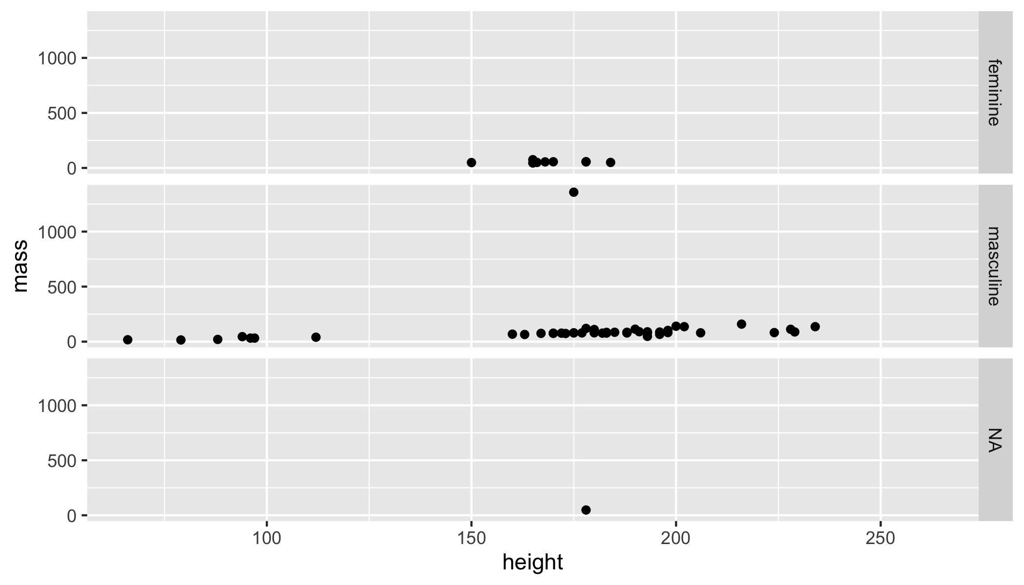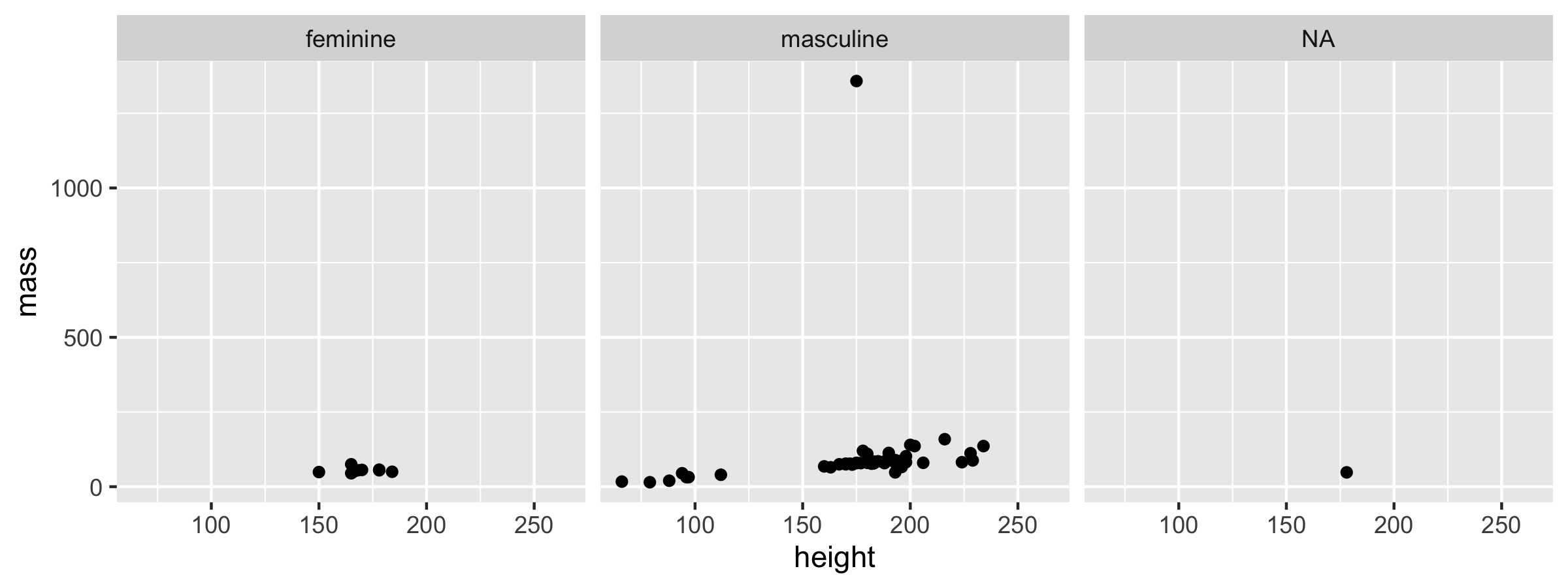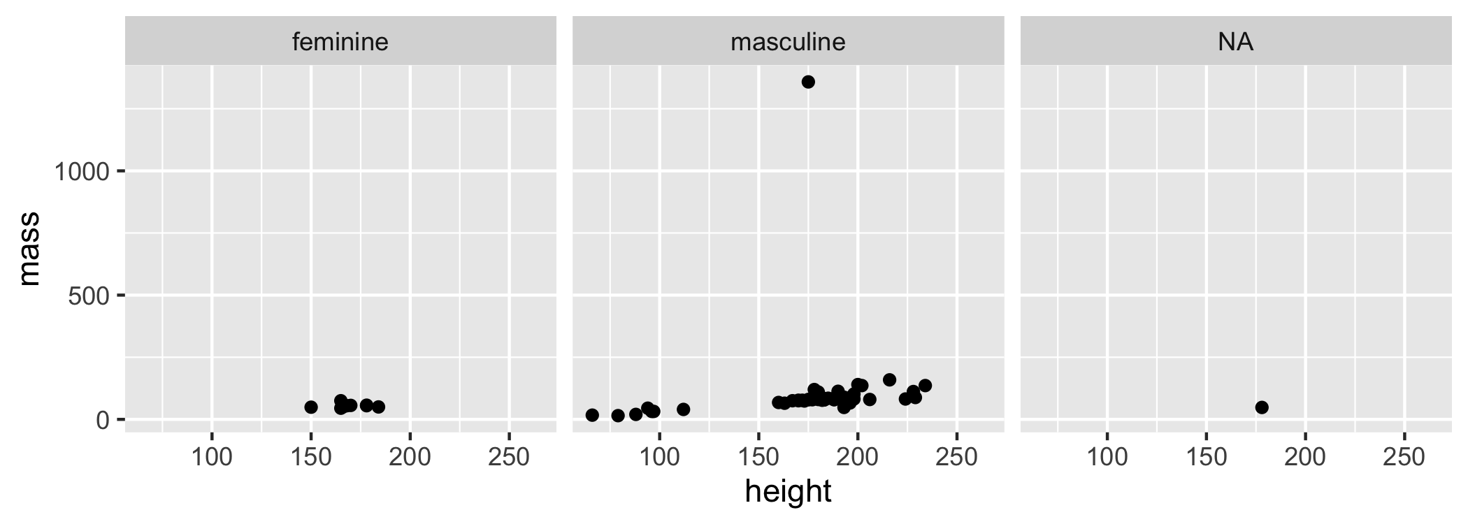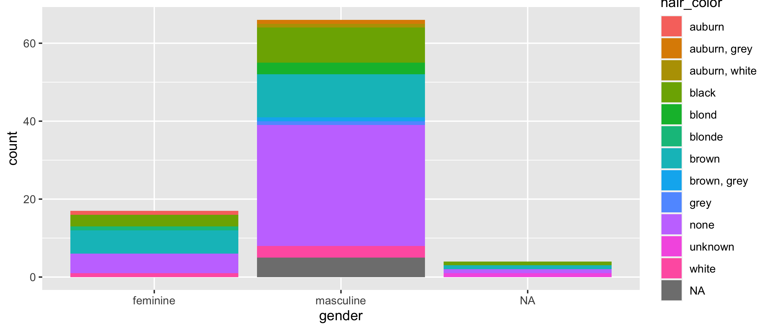 class: ur-title, center, middle, title-slide # BST430 Lecture 2 ## ggplot (i) ### Andrew McDavid ### U of Rochester ### 2021-08-29 (updated: 2021-08-29) --- ## Catch up - Catch up on informal "requirements": + Add your name (first and last) to your GitHub profile, ideally add your photo as well + Similarly, add your name (first and last) to your RStudio.Cloud profile as well <!-- - Tips for asking questions via GitHub issues--> --- ## Agenda - Exploratory data analysis - Data visualization - Visualizing Star Wars - Aesthetics - Faceting - Identifying variables - Visualizing numerical data - Visualizing categorical data --- class: center, middle # Exploratory data analysis --- ## What is EDA?  - Exploratory data analysis (EDA) is an approach to analyzing data sets to summarize its main characteristics. - Often, this is visual. That's what we're focusing on today. - But we might also calculate summary statistics and perform data wrangling/manipulation/transformation at (or before) this stage of the analysis. --- class: center, middle # Data visualization --- ## Data visualization > *"The simple graph has brought more information to the data analyst’s mind than any other device." — John Tukey* - Data visualization is the creation and study of the visual representation of data. - There are many tools for visualizing data (R is one of them), and many approaches/systems within R for making data visualizations (**ggplot2** is one of them, and that's the one we're going to use). --- ## ggplot2, part of the tidyverse - ggplot2 is a data visualization package - To use ggplot2 functions, first load tidyverse ```r library(tidyverse) ``` - In ggplot2 the structure of the code for plots can often be summarized as ```r ggplot + geom_xxx ``` or, more precisely .small[ ```r ggplot(data = [dataset], mapping = aes(x = [x-variable], y = [y-variable])) + geom_xxx() + other options ``` ] - Geoms, short for geometric objects, describe the type of plot you will produce --- ## About ggplot2 - ggplot2 is the name of the package - The `gg` in "ggplot2" stands for Grammar of Graphics - Inspired by the book **Grammar of Graphics** by Leland Wilkinson - `ggplot()` is the main function in ggplot2 - For help with the ggplot2, see http://ggplot2.tidyverse.org/ --- class: center, middle # Visualizing Star Wars --- ## Dataset terminology .scroll-box-14[ ```r starwars ``` ``` ## # A tibble: 87 × 14 ## name height mass hair_color skin_color eye_color birth_year sex gender ## <chr> <int> <dbl> <chr> <chr> <chr> <dbl> <chr> <chr> ## 1 Luke S… 172 77 blond fair blue 19 male mascu… ## 2 C-3PO 167 75 <NA> gold yellow 112 none mascu… ## 3 R2-D2 96 32 <NA> white, bl… red 33 none mascu… ## 4 Darth … 202 136 none white yellow 41.9 male mascu… ## 5 Leia O… 150 49 brown light brown 19 fema… femin… ## 6 Owen L… 178 120 brown, grey light blue 52 male mascu… ## 7 Beru W… 165 75 brown light blue 47 fema… femin… ## 8 R5-D4 97 32 <NA> white, red red NA none mascu… ## 9 Biggs … 183 84 black light brown 24 male mascu… ## 10 Obi-Wa… 182 77 auburn, wh… fair blue-gray 57 male mascu… ## # … with 77 more rows, and 5 more variables: homeworld <chr>, species <chr>, ## # films <list>, vehicles <list>, starships <list> ``` ] <div class="question"> What does each row represent? What does each column represent? </div> --- ## Luke Skywalker  --- ## What's in the Star Wars data? Take a `glimpse` at the data: .scroll-box-14[ ```r glimpse(starwars) ``` ``` ## Rows: 87 ## Columns: 14 ## $ name <chr> "Luke Skywalker", "C-3PO", "R2-D2", "Darth Vader", "Leia Or… ## $ height <int> 172, 167, 96, 202, 150, 178, 165, 97, 183, 182, 188, 180, 2… ## $ mass <dbl> 77.0, 75.0, 32.0, 136.0, 49.0, 120.0, 75.0, 32.0, 84.0, 77.… ## $ hair_color <chr> "blond", NA, NA, "none", "brown", "brown, grey", "brown", N… ## $ skin_color <chr> "fair", "gold", "white, blue", "white", "light", "light", "… ## $ eye_color <chr> "blue", "yellow", "red", "yellow", "brown", "blue", "blue",… ## $ birth_year <dbl> 19.0, 112.0, 33.0, 41.9, 19.0, 52.0, 47.0, NA, 24.0, 57.0, … ## $ sex <chr> "male", "none", "none", "male", "female", "male", "female",… ## $ gender <chr> "masculine", "masculine", "masculine", "masculine", "femini… ## $ homeworld <chr> "Tatooine", "Tatooine", "Naboo", "Tatooine", "Alderaan", "T… ## $ species <chr> "Human", "Droid", "Droid", "Human", "Human", "Human", "Huma… ## $ films <list> <"The Empire Strikes Back", "Revenge of the Sith", "Return… ## $ vehicles <list> <"Snowspeeder", "Imperial Speeder Bike">, <>, <>, <>, "Imp… ## $ starships <list> <"X-wing", "Imperial shuttle">, <>, <>, "TIE Advanced x1",… ``` ] --- ## What's in the Star Wars data? Run the following **in the Console** to view the help ```r ?starwars ```  <div class="question"> How many rows and columns does this dataset have? What does each row represent? What does each column represent? </div> <div class="question"> Make a prediction: What relationship do you expect to see between height and mass? </div> --- ## Danged computer, stop doing what I tell you to do. <div class = "middle"> <div class="question"> What will happen if you entered this into the Console: </div> ```r glimpse(Starwars) ``` -- ```r glimpse(Starwars) ``` ``` ## Error in glimpse(Starwars): object 'Starwars' not found ``` -- .alert[R is case sensitive!] </div> --- ## Mass vs. height ```r ggplot(data = starwars, mapping = aes(x = height, y = mass)) + geom_point() ``` ``` ## Warning: Removed 28 rows containing missing values (geom_point). ``` <!-- --> --- ## What's that warning? -- - Not all characters have height and mass information (hence 28 of them not plotted) ``` ## Warning: Removed 28 rows containing missing values (geom_point). ``` - Going forward I'll suppress the warning to save room on slides, but it's important to note it --- ## Mass vs. height <div class="question"> How would you describe this relationship? What other variables would help us understand data po