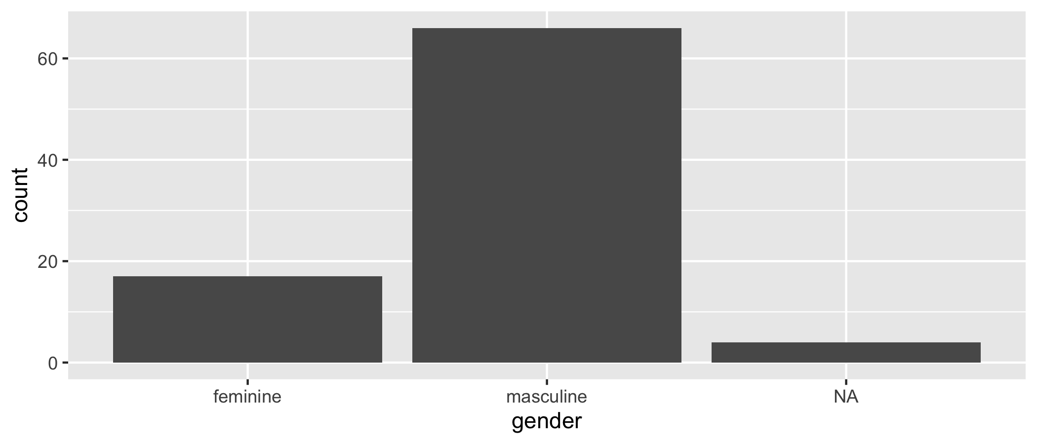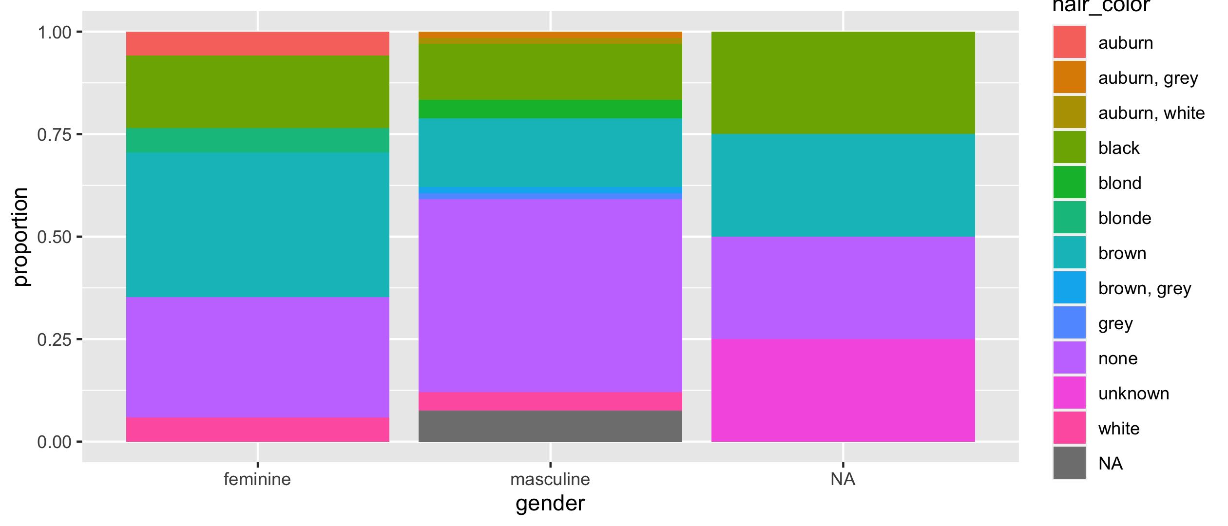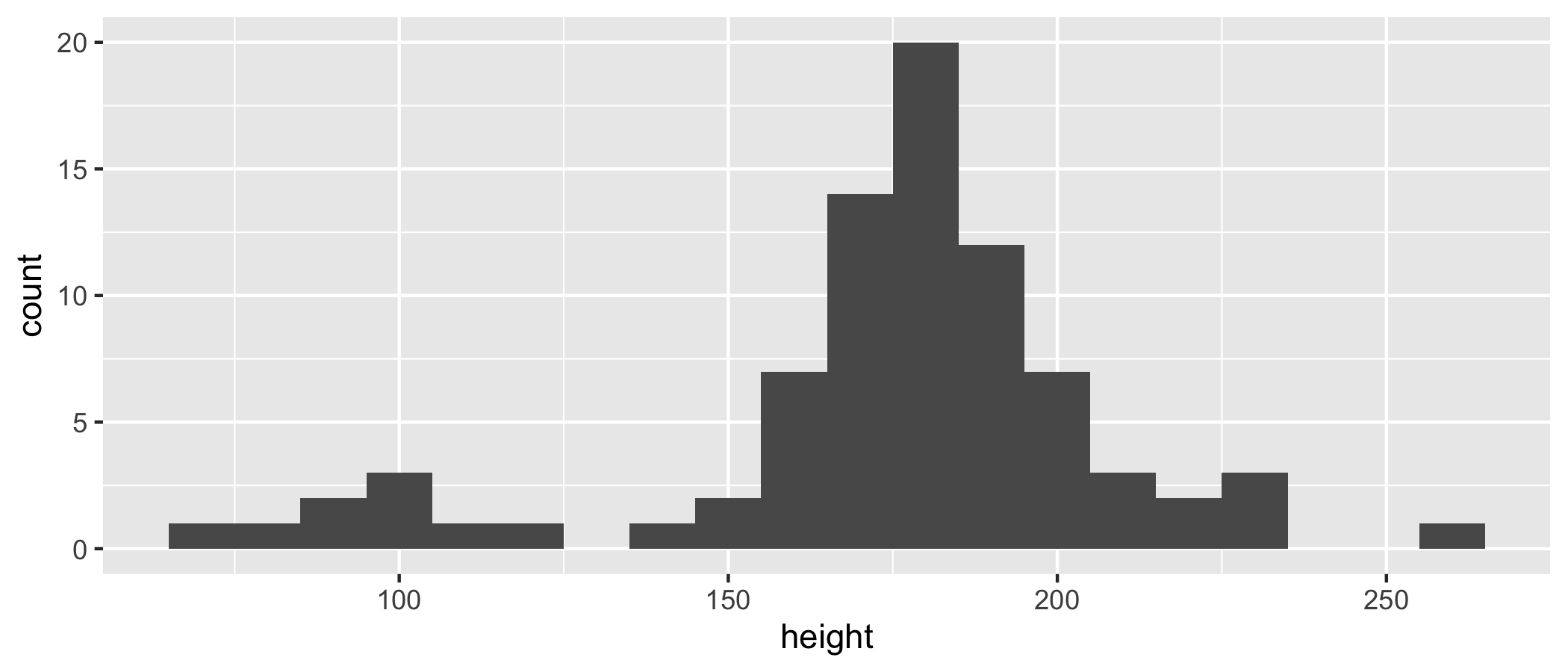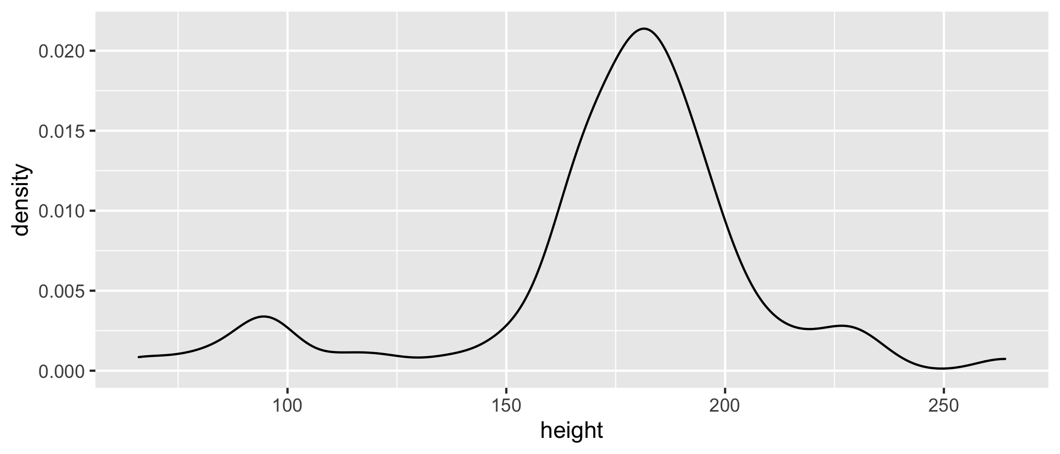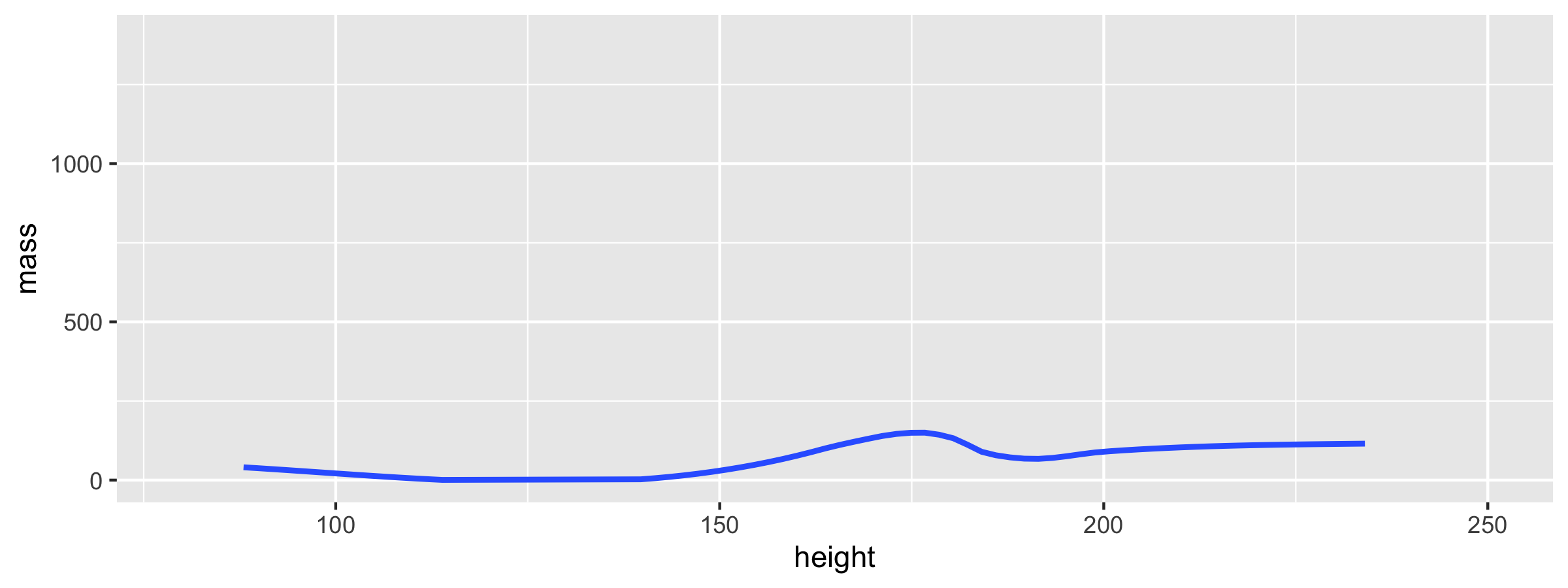 class: ur-title, center, middle, title-slide # BST430 Lecture 2 ## ggplot (i) ### Andrew McDavid ### U of Rochester ### 2021-08-29 (updated: 2021-08-29) --- ## Catch up - Catch up on informal "requirements": + Add your name (first and last) to your GitHub profile, ideally add your photo as well + Similarly, add your name (first and last) to your RStudio.Cloud profile as well <!-- - Tips for asking questions via GitHub issues--> --- ## Agenda - Exploratory data analysis - Data visualization - Visualizing Star Wars - Aesthetics - Faceting - Identifying variables - Visualizing numerical data - Visualizing categorical data --- class: center, middle # Exploratory data analysis --- ## What is EDA?  - Exploratory data analysis (EDA) is an approach to analyzing data sets to summarize its main characteristics. - Often, this is visual. That's what we're focusing on today. - But we might also calculate summary statistics and perform data wrangling/manipulation/transformation at (or before) this stage of the analysis. --- class: center, middle # Data visualization --- ## Data visualization > *"The simple graph has brought more information to the data analyst’s mind than any other device." — John Tukey* - Data visualization is the creation and study of the visual representation of data. - There are many tools for visualizing data (R is one of them), and many approaches/systems within R for making data visualizations (**ggplot2** is one of them, and that's the one we're going to use). --- ## ggplot2, part of the tidyverse - ggplot2 is a data visualization package - To use ggplot2 functions, first load tidyverse ```r library(tidyverse) ``` - In ggplot2 the structure of the code for plots can often be summarized as ```r ggplot + geom_xxx ``` or, more precisely .small[ ```r ggplot(data = [dataset], mapping = aes(x = [x-variable], y = [y-variable])) + geom_xxx() + other options ``` ] - Geoms, short for geometric objects, describe the type of plot you will produce --- ## About ggplot2 - ggplot2 is the name of the package - The `gg` in "ggplot2" stands for Grammar of Graphics - Inspired by the book **Grammar of Graphics** by Leland Wilkinson - `ggplot()` is the main function in ggplot2 - For help with the ggplot2, see http://ggplot2.tidyverse.org/ --- class: center, middle # Visualizing Star Wars --- ## Dataset terminology .scroll-box-14[ ```r starwars ``` ``` ## # A tibble: 87 × 14 ## name height mass hair_color skin_color eye_color birth_year sex gender ## <chr> <int> <dbl> <chr> <chr> <chr> <dbl> <chr> <chr> ## 1 Luke S… 172 77 blond fair blue 19 male mascu… ## 2 C-3PO 167 75 <NA> gold yellow 112 none mascu… ## 3 R2-D2 96 32 <NA> white, bl… red 33 none mascu… ## 4 Darth … 202 136 none white yellow 41.9 male mascu… ## 5 Leia O… 150 49 brown light brown 19 fema… femin… ## 6 Owen L… 178 120 brown, grey light blue 52 male mascu… ## 7 Beru W… 165 75 brown light blue 47 fema… femin… ## 8 R5-D4 97 32 <NA> white, red red NA none mascu… ## 9 Biggs … 183 84 black light brown 24 male mascu… ## 10 Obi-Wa… 182 77 auburn, wh… fair blue-gray 57 male mascu… ## # … with 77 more rows, and 5 more variables: homeworld <chr>, species <chr>, ## # films <list>, vehicles <list>, starships <list> ``` ] <div class="question"> What does each row represent? What does each column represent? </div> --- ## Luke Skywalker  --- ## What's in the Star Wars data? Take a `glimpse` at the data: .scroll-box-14[ ```r glimpse(starwars) ``` ``` ## Rows: 87 ## Columns: 14 ## $ name <chr> "Luke Skywalker", "C-3PO", "R2-D2", "Darth Vader", "Leia Or… ## $ height <int> 172, 167, 96, 202, 150, 178, 165, 97, 183, 182, 188, 180, 2… ## $ mass <dbl> 77.0, 75.0, 32.0, 136.0, 49.0, 120.0, 75.0, 32.0, 84.0, 77.… ## $ hair_color <chr> "blond", NA, NA, "none", "brown", "brown, grey", "brown", N… ## $ skin_color <chr> "fair", "gold", "white, blue", "white", "light", "light", "… ## $ eye_color <chr> "blue", "yellow", "red", "yellow", "brown", "blue", "blue",… ## $ birth_year <dbl> 19.0, 112.0, 33.0, 41.9, 19.0, 52.0, 47.0, NA, 24.0, 57.0, … ## $ sex <chr> "male", "none", "none", "male", "female", "male", "female",… ## $ gender <chr> "masculine", "masculine", "masculine", "masculine", "femini… ## $ homeworld <chr> "Tatooine", "Tatooine", "Naboo", "Tatooine", "Alderaan", "T… ## $ species <chr> "Human", "Droid", "Droid", "Human", "Human", "Human", "Huma… ## $ films <list> <"The Empire Strikes Back", "Revenge of the Sith", "Return… ## $ vehicles <list> <"Snowspeeder", "Imperial Speeder Bike">, <>, <>, <>, "Imp… ## $ starships <list> <"X-wing", "Imperial shuttle">, <>, <>, "TIE Advanced x1",… ``` ] --- ## What's in the Star Wars data? Run the following **in the Console** to view the help ```r ?starwars ```  <div class="question"> How many rows and columns does this dataset have? What does each row represent? What does each column represent? </div> <div class="question"> Make a prediction: What relationship do you expect to see between height and mass? </div> --- ## Danged computer, stop doing what I tell you to do. <div class = "middle"> <div class="question"> What will happen if you entered this into the Console: </div> ```r glimpse(Starwars) ``` -- ```r glimpse(Starwars) ``` ``` ## Error in glimpse(Starwars): object 'Starwars' not found ``` -- .alert[R is case sensitive!] </div> --- ## Mass vs. height ```r ggplot(data = starwars, mapping = aes(x = height, y = mass)) + geom_point() ``` ``` ## Warning: Removed 28 rows containing missing values (geom_point). ``` <!-- --> --- ## What's that warning? -- - Not all characters have height and mass information (hence 28 of them not plotted) ``` ## Warning: Removed 28 rows containing missing values (geom_point). ``` - Going forward I'll suppress the warning to save room on slides, but it's important to note it --- ## Mass vs. height <div class="question"> How would you describe this relationship? What other variables would help us understand data po